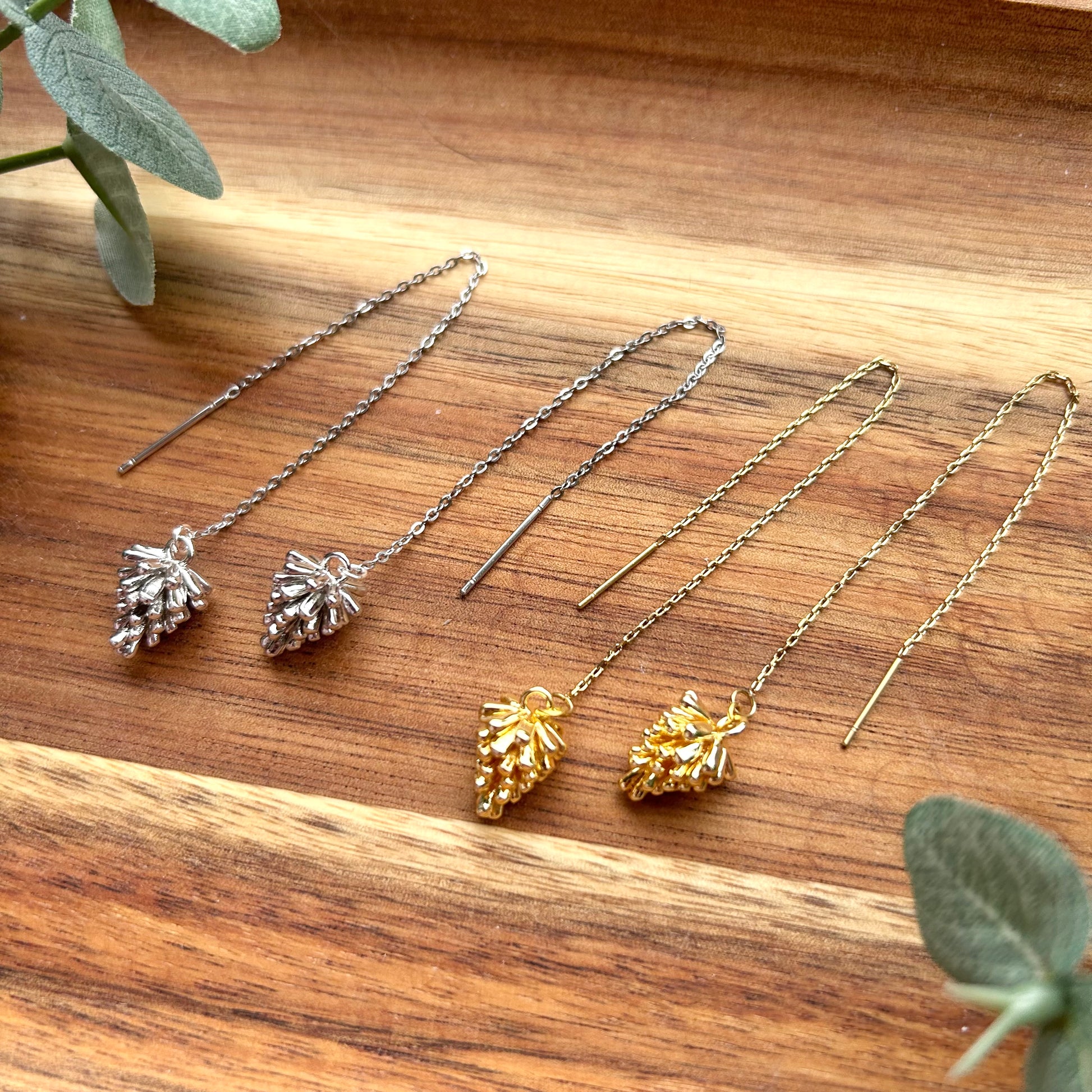 Två par örhänge med små, söta "kottar" i silver och/eller guld - välj din favorit. Längd ca 9cm.